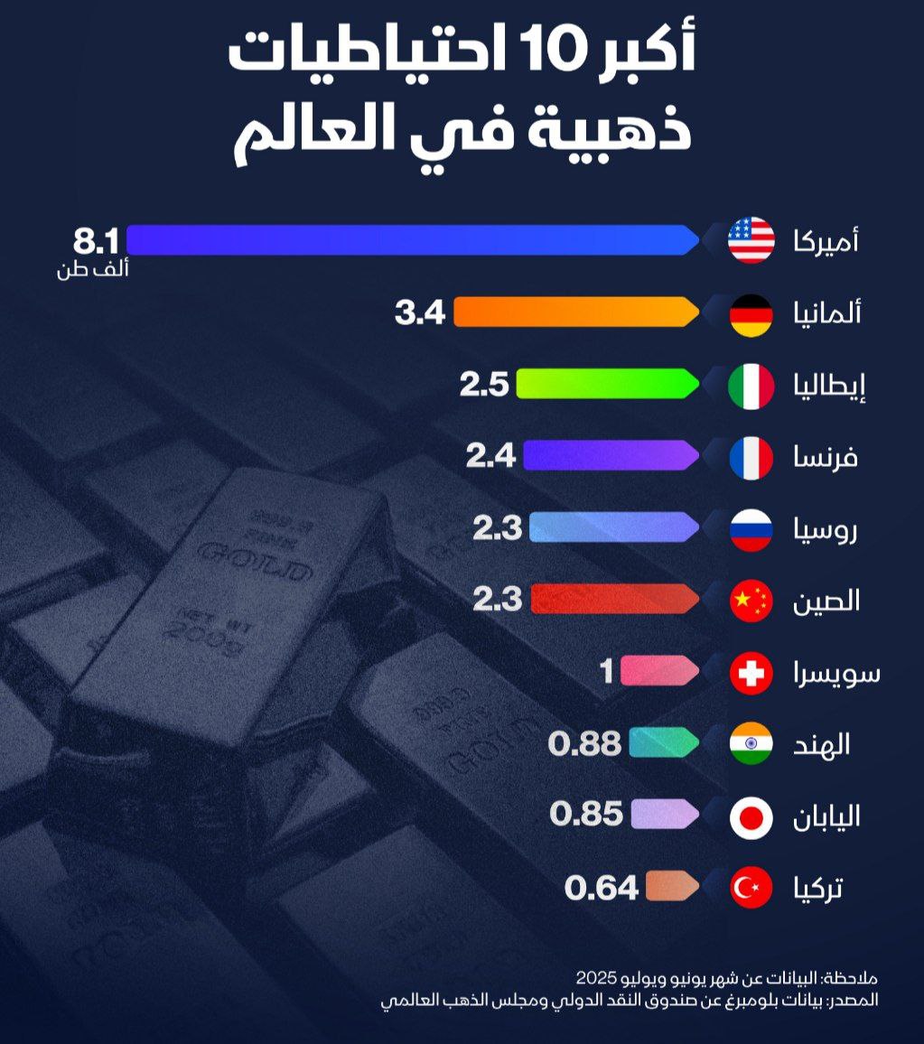 اخبار السلع, عالميأميركا تمتلك أكبر احتياطي من الذهب في العالم بنحو 8.1 ألف طن📍ألمانيا جاءت ثانية باحتياطي بلغ 3.4 ألف طن 📍تعرف على أكبر 10 احتياطيات ذهبية في العالم