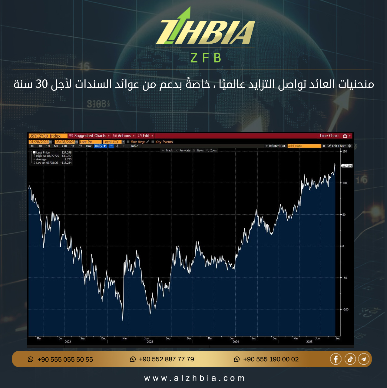 في الولايات المتحدة 🇺🇸، الفارق بين عوائد السندات لأجل سنتين (2Y) و 30 سنة (30Y) (الخزانة الأميركية USTs) وصل إلى أوسع مستوى منذ يناير 2022.