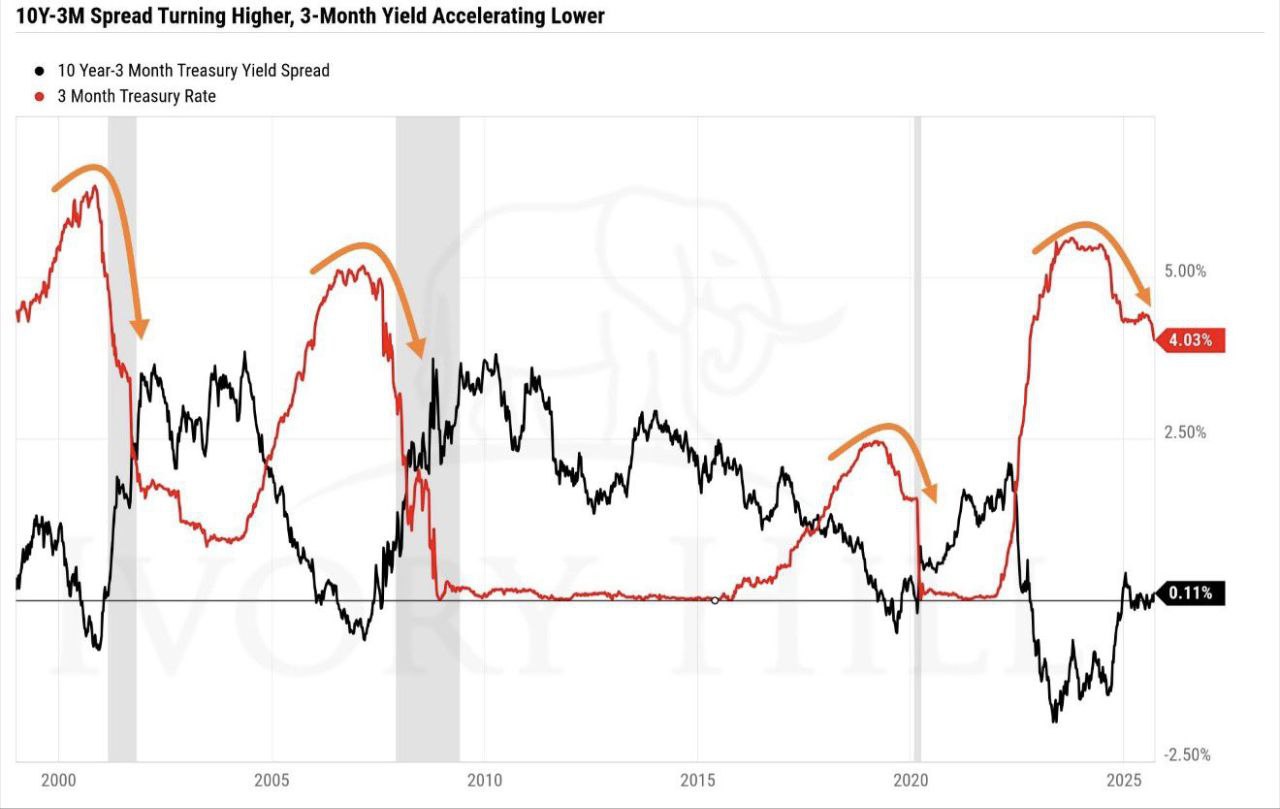 🔻 فائدة قصيرة ↓ + 🔺 ميل المنحنى ↑ ⇒ غالبًا ما يتبعها ركود (كما في الفترات الرمادية سابقًا).