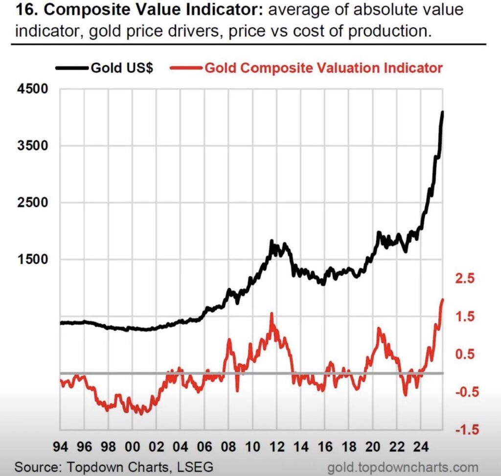 مؤشر القيمة المركّب للذهب يظهر أن السعر حاليًا عند أعلى مستوى له منذ 30 عامًا، أي فوق قيمته التاريخية. العوامل...
