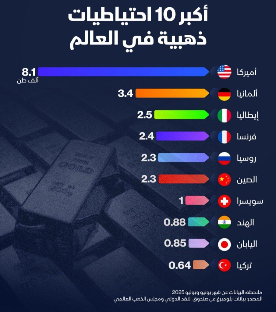 📍ألمانيا جاءت ثانية باحتياطي بلغ 3.4 ألف طن 📍تعرف على أكبر 10 احتياطيات ذهبية في العالم