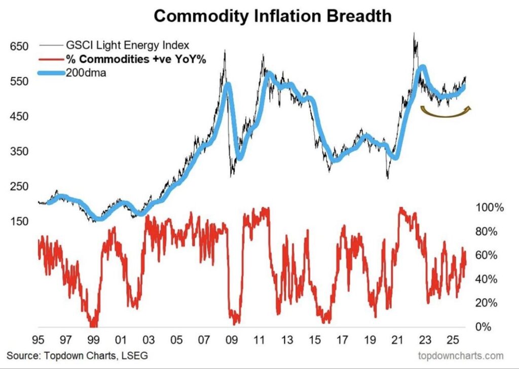 🔹 اتساع التضخم عبر السلع يرتفع مجددًا نحو 60%—مستوى تاريخيًا يسبق غالبًا دورات صعود قوية (مثل 2000، 2007، 2021). 🔹...